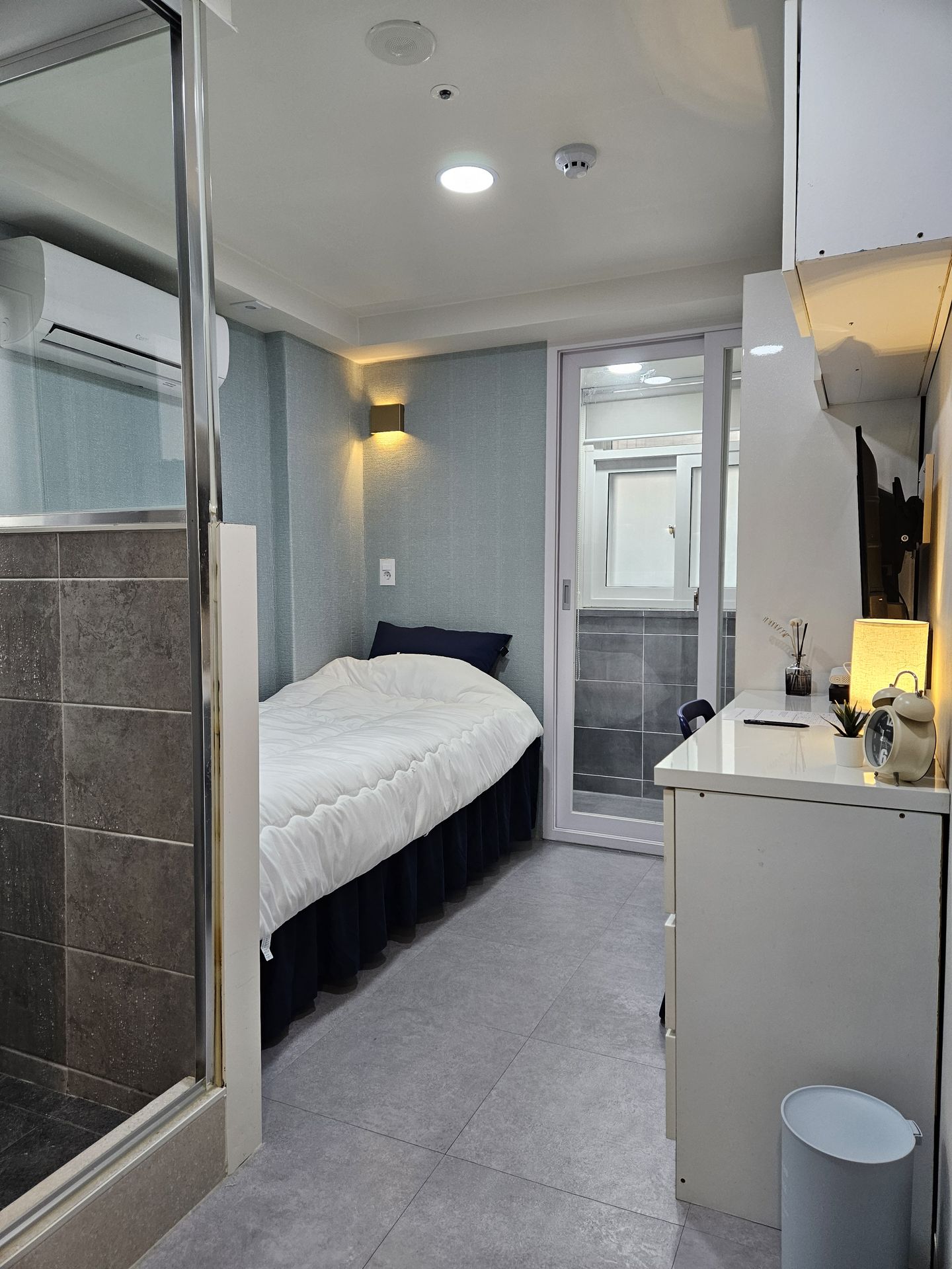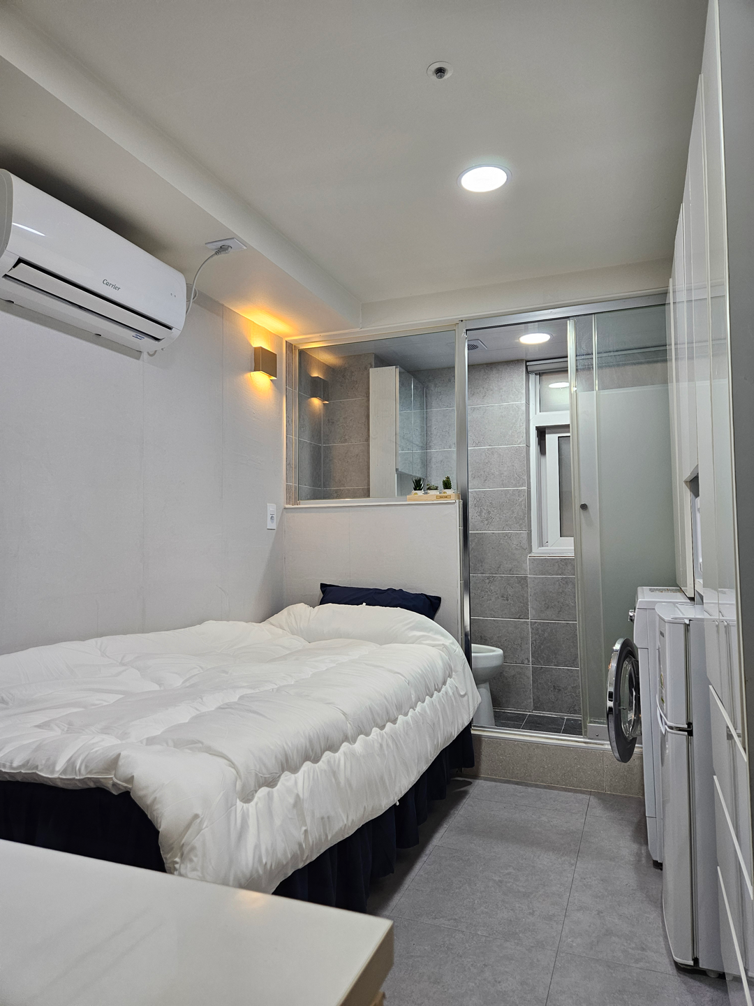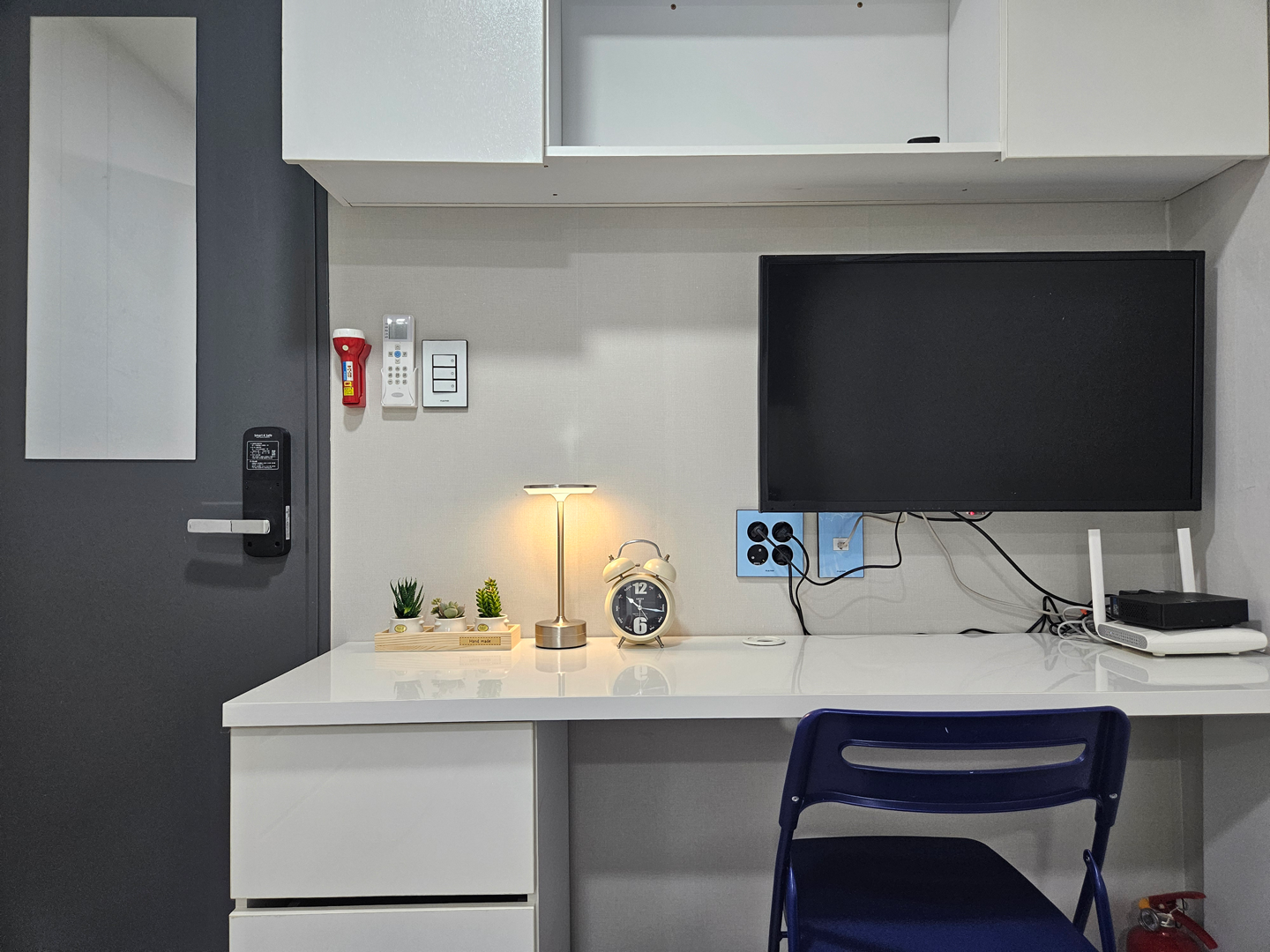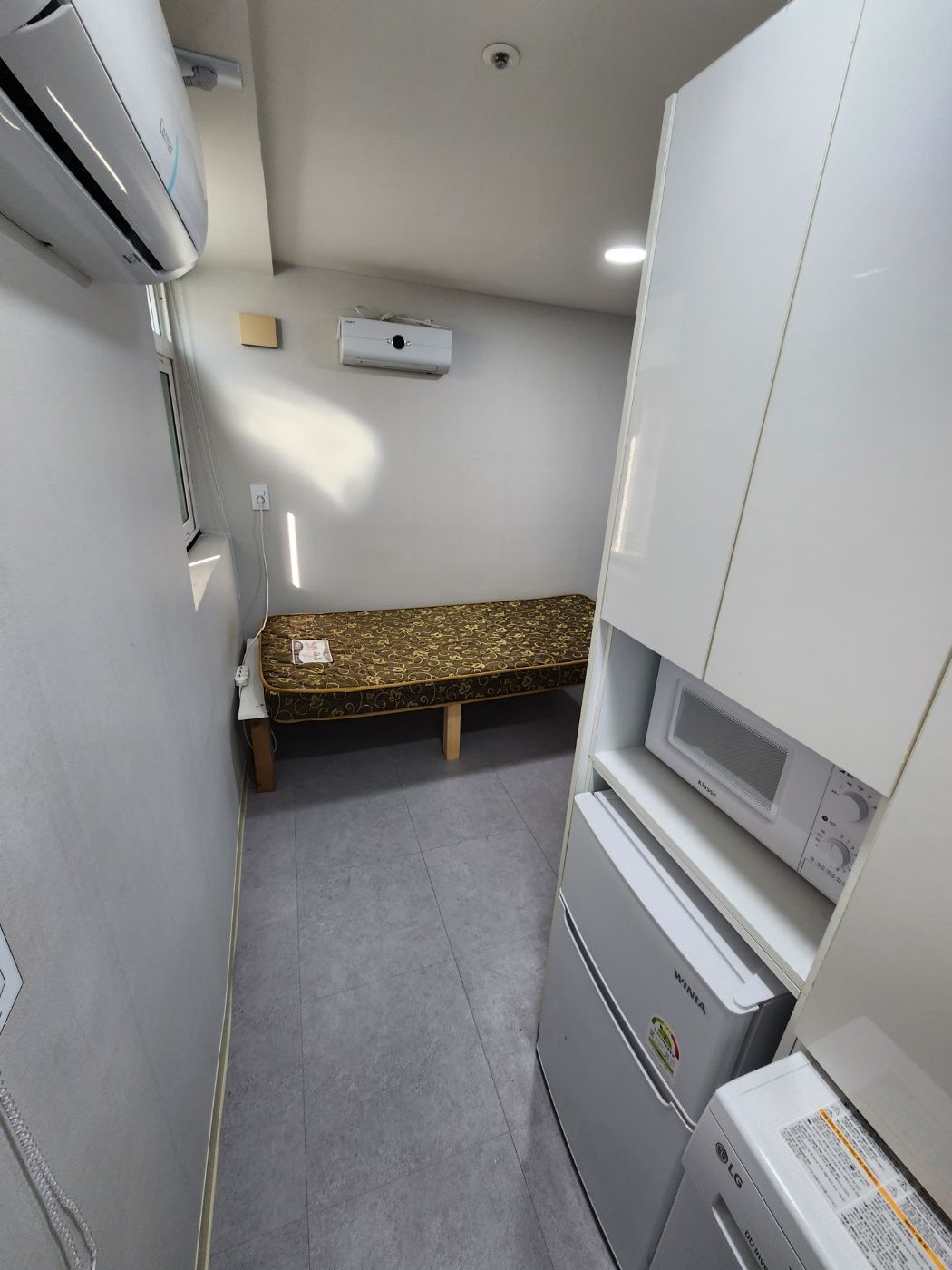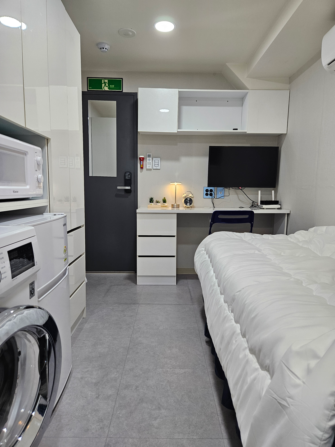 개인시설 : 침대, 책상및 상단 수납장, 옷장및 수납장, 개별WIFI , 도어락, 에어컨 , 전자렌지 , 2도어냉장고(냉동+냉장칸), LG드럼세탁기, 32인치 벽걸이TV , 취침등, 넓은창문, 화장실 ,욕실, 거울장 , 신발장