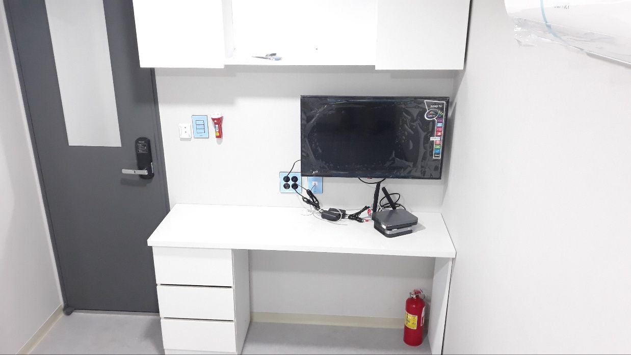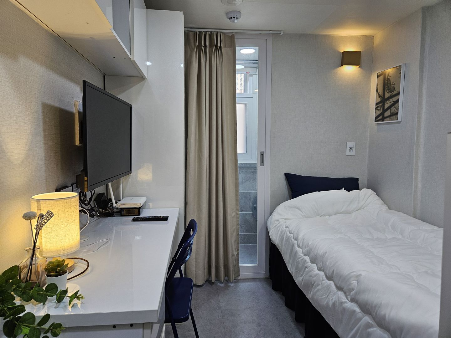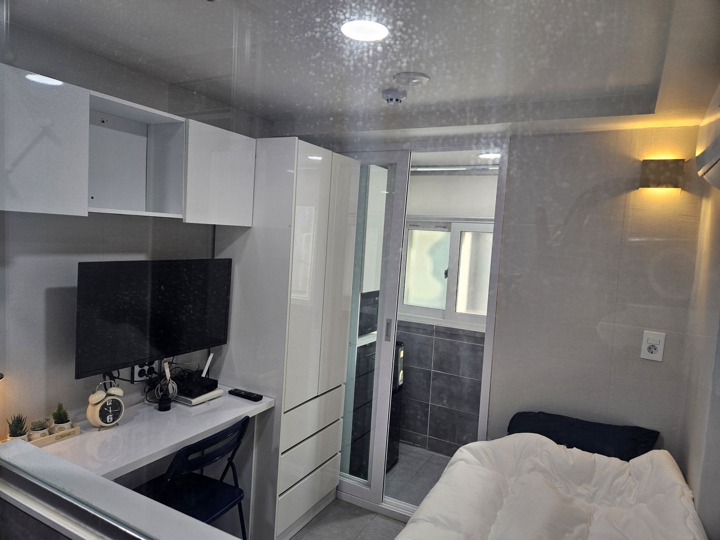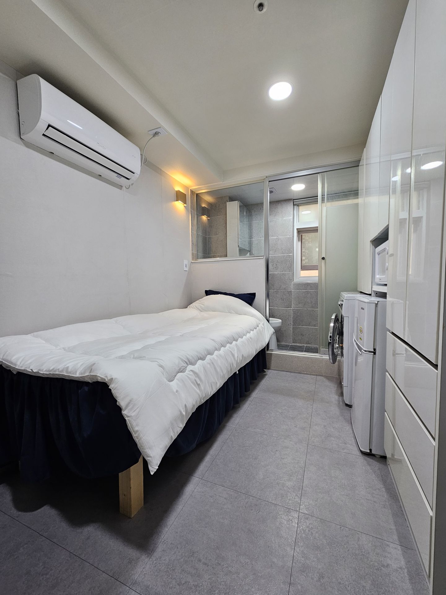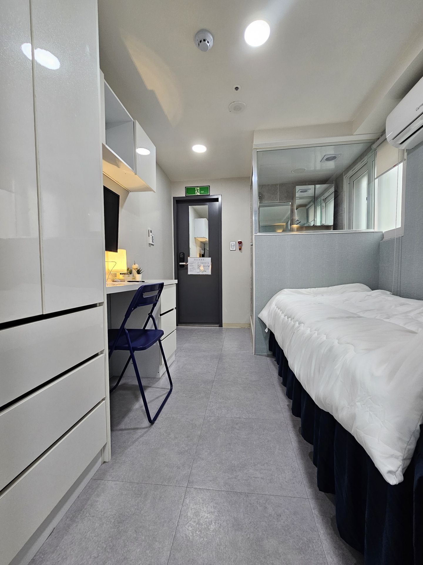 개인시설 : 침대, 책상및 상단 수납장, 옷장및 수납장, 개별WIFI , 도어락, 에어컨 , 전자렌지 , 2도어냉장고(냉동+냉장칸), LG드럼세탁기, 32인치 벽걸이TV , 취침등, 넓은창문, 화장실 ,욕실, 거울장 , 신발장