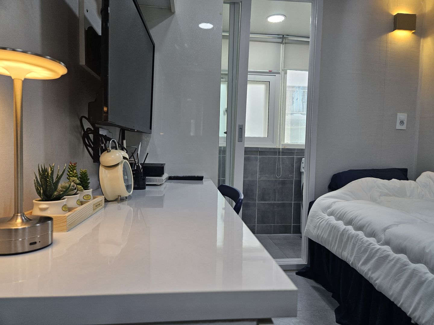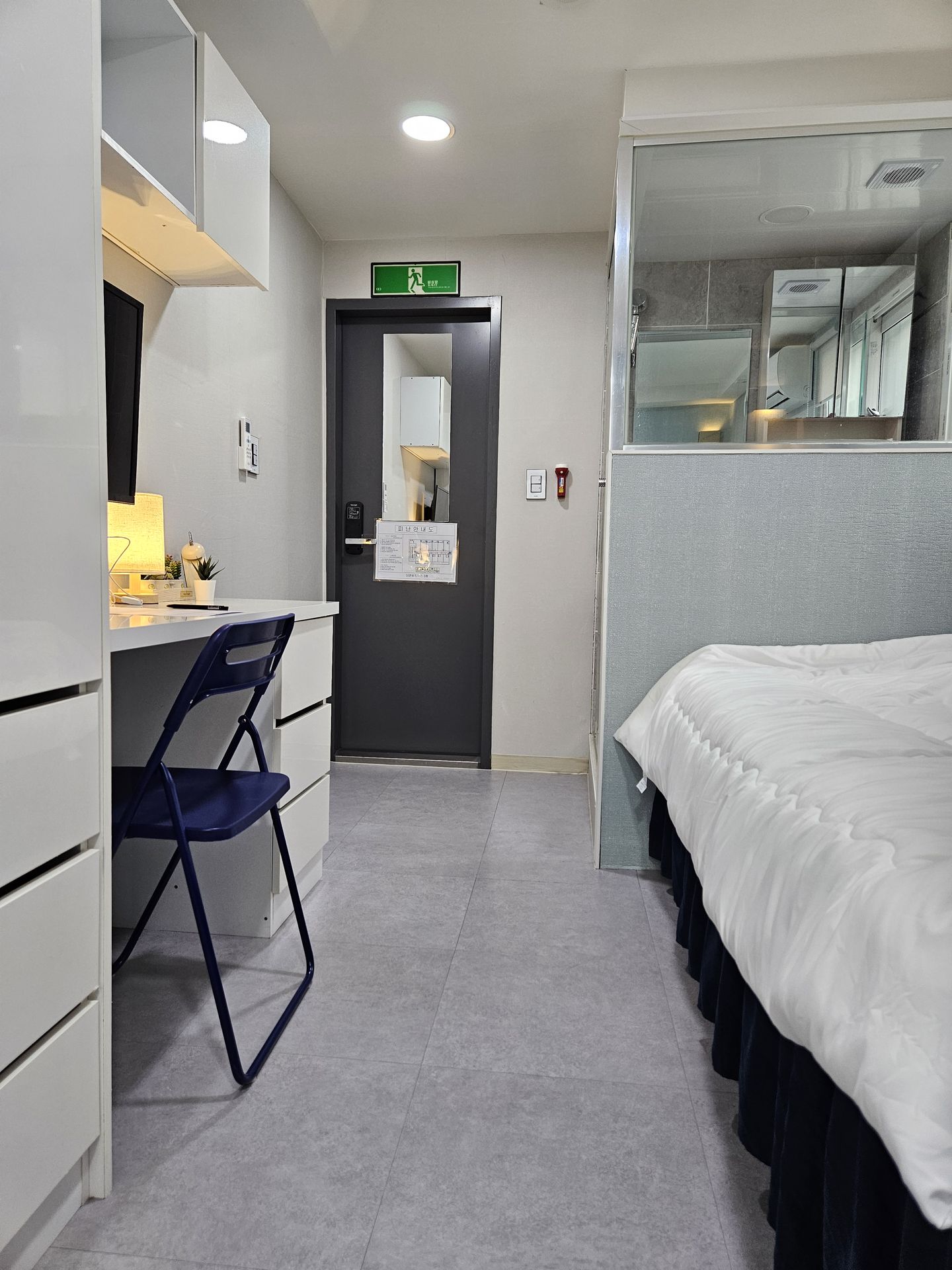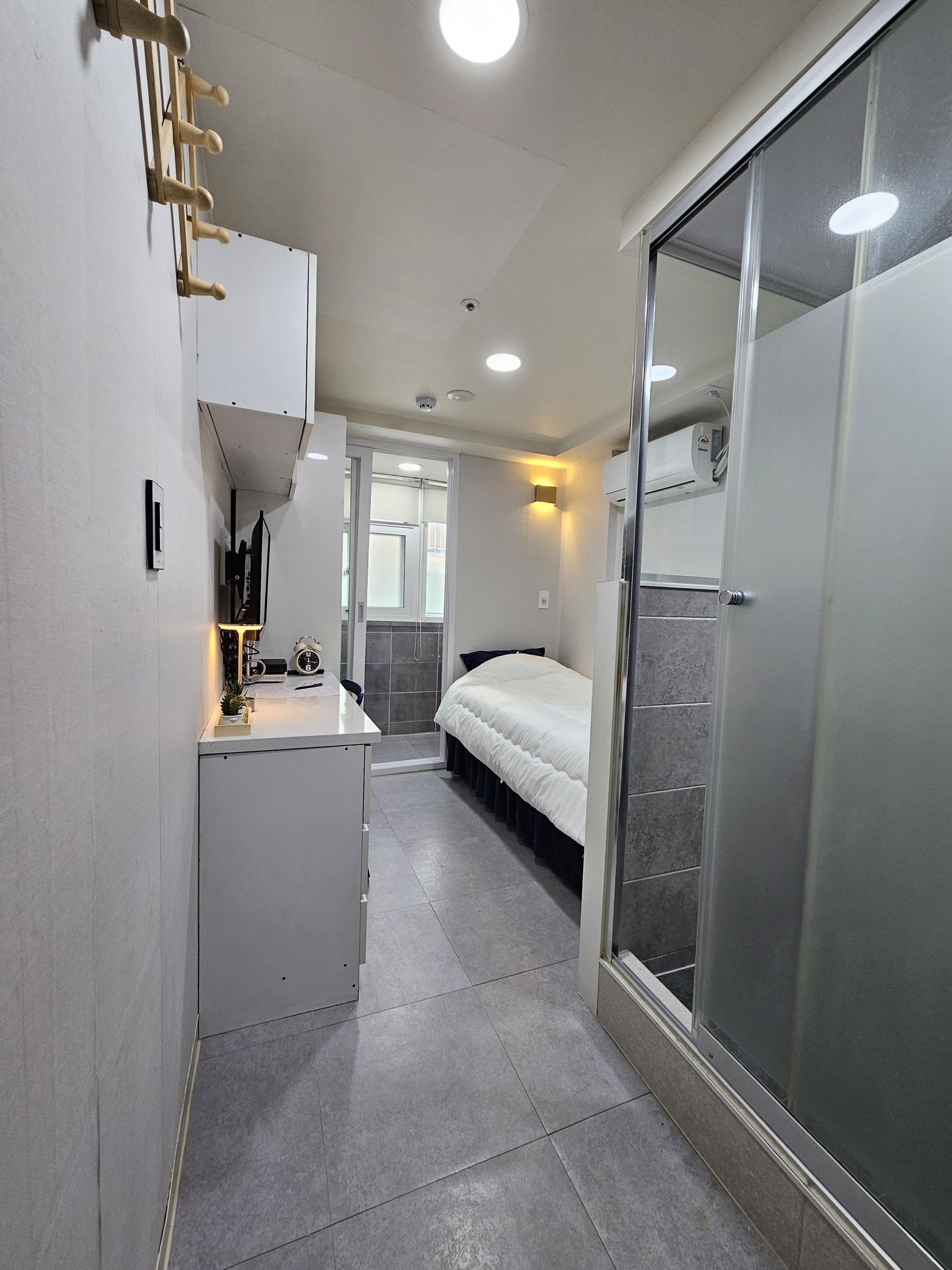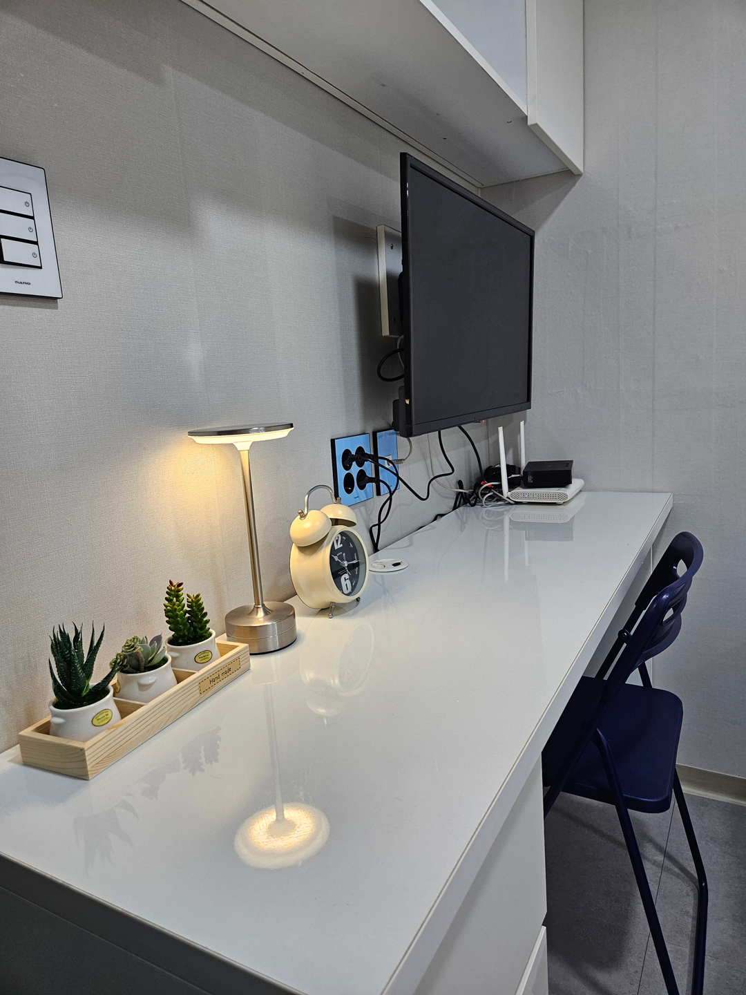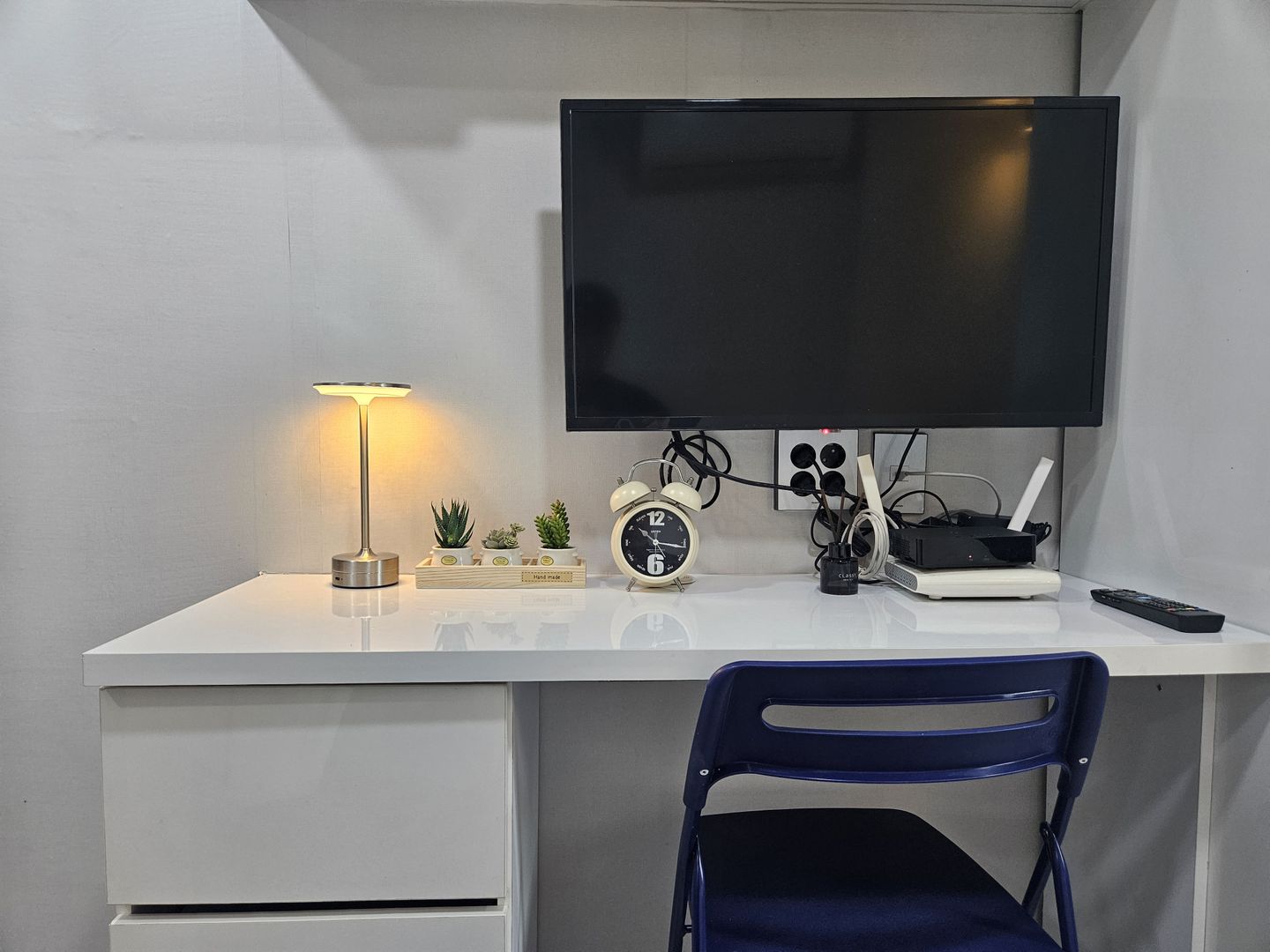 개인시설 : 침대, 책상및 상단 수납장, 옷장및 수납장, 개별WIFI , 도어락, 에어컨 , 전자렌지 , 2도어냉장고(냉동+냉장칸), LG드럼세탁기, 32인치 벽걸이TV , 취침등, 넓은창문, 화장실 ,욕실, 거울장 , 신발장